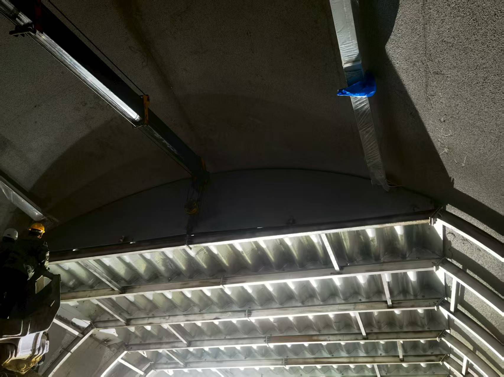 创新采用钢波纹板结构,配以工字钢套拱加固,共同组成摩天岭隧道主洞的送风通道。钢波纹板+工字钢套拱这一组合不仅实现了结构的轻量化,更创造了卓越的承载能力和耐久性。