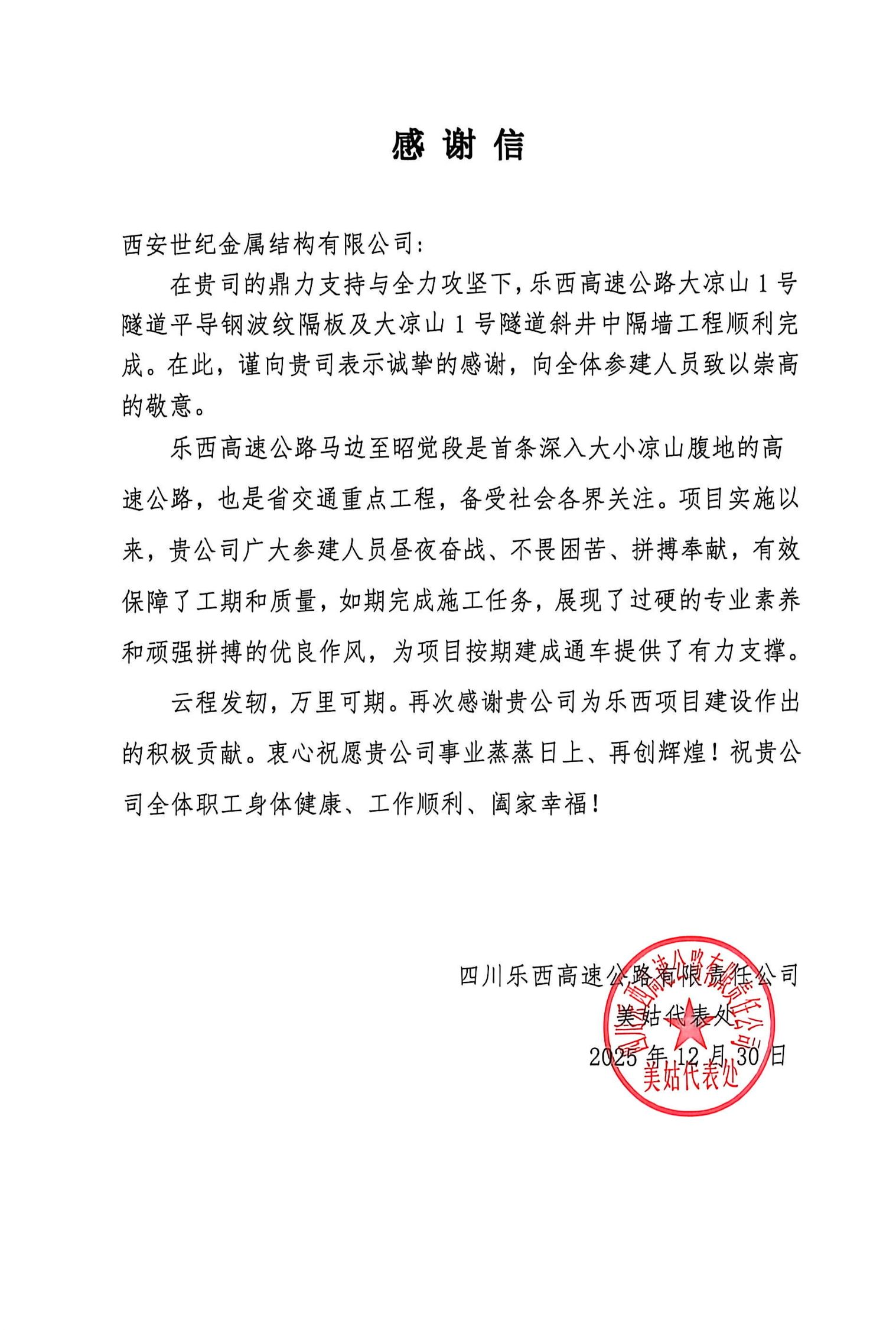此次获誉,不仅是一份肯定,更是新征程的起点。在蜀道之上,我们用钢铁铸就穿山的筋骨;于千峰万壑间,以匠心绘就时代的通途。这封来自大凉山的感谢信,托付着信赖,也承载着期许。西安世纪将带着此次攻坚的光辉见证,续写新的篇章,继续以钢铁为笔,以山河为卷,在每一个需要坚固与精密的角落,诠释“世纪工匠”的精神。让每一道钢结构,都成为大地稳健的脉搏;让每一次担当,都化为时代向前延伸的轨道。